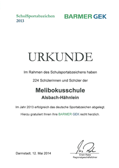 In diesem Schuljahr erreichten mit 224 von 615 mehr Schülerinnen und Schüler der MELI ein Sportabzeichen. Der damit erreichte bessere Prozentwert von 36,42 war diesmal der dritthöchste aller Schulen mit 500 bis 1000 Schülerinnen und Schülern im Sportkreis 33 Darmstadt-Dieburg. Dafür wurde unsere Schule mit der Verleihung einer Urkunde der BARMER GEK geehrt.N In der neuen Kletterhalle des DAV in Darmstadt nahm Schulsportleiter Thomas Schorr an der Preisverleihung der BARMER und der Sparkasse Darmstadt stellvertretend für die Schule die Urkunde entgegen.