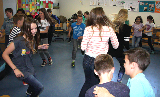 Die Kinder hatten viel Spaß beim Weitergeben eines Würfels zu Musik, der geworfen wurde, wenn diese aufhörte. Bei der höchsten Punktzahl musste man nicht nur einen, sondern drei zuvor geübte kurze Sätze (je m’appelle…, j’habite à…, j’aime le/la…) nennen. Sehr gut kam auch ein Spiel an, bei dem auf Karten unter anderem eine Rose abgebildet war und bei dem diese „geschnappt“ werden musste, wenn das Wort in einem Lied vorkam. Daraus wurde regelrecht ein Wettspiel zwischen zwei Gruppen.