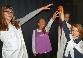 In der nächsten Stunde mussten wir das Theaterstück dann vorspielen. Das Ganze hat ziemlich viel Spaß gemacht, weil wir uns gegenseitig geschminkt und verkleidet haben. Wir sahen alle ziemlich komisch aus, in langen Gewändern und Umhängen.