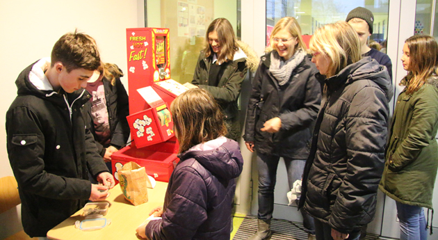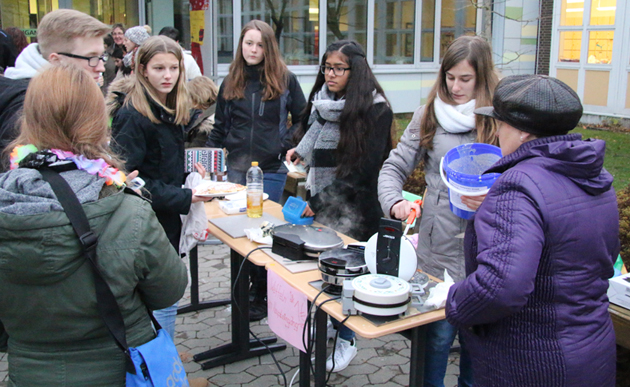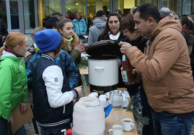 Der Markttag war nicht nur ein Augenschmaus. Im Beisein der Gäste wurde Apfelmost hergestellt, der kalt oder warm angeboten wurde. Der Plätzchenduft der dargebotenen Weihnachtskekse, frisches Popcorn und die selbstgemachte Marmelade, weihnachtlich verpackt, taten ihr Übriges, um die weihnachtliche Stimmung zu betonen. Nicht nur süße Leckereien wie Crepes, Waffeln, Pop-cakes und ein reichhaltiges Kuchen- und Tortenangebot in der Cafeteria verwöhnten die Gäste, auch Herzhaftes wie Pizza, Chilli con carne, internationale Küche und Raclette wurde angeboten.