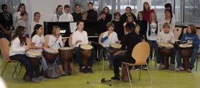An weiteren Ständen stellten sich die Schülervertretung, die Hauasaufgabenbetreuung sowie die familienfreundliche Schule vor – einen bunten, leckeren Coctail konnte man sich dort ebenfalls schmecken lassen. In der gerade mitten in der Renovierung steckendenPausenhalle wurde das Jahrbuch 2010 verkauft, an dem einfach niemand vorbei(laufen) konnte, ohne sich nicht ein Exemplar mitzunehmen. Mit diesem in der Hand (oder unterm Arm) machte man sich dann (wieder) auf die Entdeckungstour in die verschiedensten Räume und Themen auf, zum Beispiel lernte man das Lernen nahm an einer Schnupperstunde in Englisch teil oder versank in den Erzählungen der Schüler über Austauschfahrten in verschiedene Länder.
