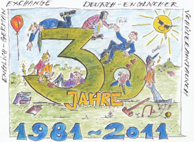Eine besondere Aufwertung erhielt die Veranstaltung durch den Besuch des Bürgermeisters von Newbury, der seinen Town Caller mitbrachte. Dieser wurde aufgrund seiner Uniform schnell ein gefragtes Fotomotiv. Nach dem Verzehr der kunstvollen Jubiläumstorte verzogen sich die meisten Jungen zum deutsch-englischen Fußballduell nach draußen, die anderen saßen bei Musik und Snacks zusammen. Die meisten trugen dabei die Jubiläums-T-Shirts mit dem oben abgebildeten Motiv, das wir allen als Gastgeschenk mitgebracht hatten.Beim Gegenbesuch der englischen Austauschgruppe aus Thtacham fand dann der zweite Teil der Jubiläumsfeierlichkeiten statt. Am 9. Mai fand dazu in unserer festlich geschmückten Cafeteria eine große Party statt, an der neben der Schülergruppe (teilweise begleitet von ihren Eltern) auch ne große Zahl an Lehrkräften teilnahm, die in den vergangenen 30 Jahren aktiv am Austausch mit der Kennet School beteiligt waren.