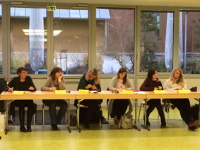 In unserer Schuljury begrüßten wir Frau Schader von der Buchhandlung Zabel aus Jugenheim, Frau Merlau eine ehemalige Deutschlehrerin unserer Schule, Frau Neuweger Deutschlehrerin, Frau Bär-Neurohr aus der Schulbibliothek, Luise Freydank unsere Schulsprecherin und Chiara Arnold Vorjahressiegerin.