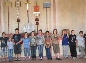 Am nächsten Tag kam für uns alle eine echt große Herausforderung, nämlich eine sich ewig hinziehende Wanderung auf den Spuren der Römer, entlang des Limes bis hin zur Saalburg. Erschöpft erreichten wir das Römerkastell und mussten nach einer Pause eine Führung dort mitmachen. Wir wurden erst wieder munter, als wir alle eine Gottheit verkörperten und uns in einer Halle aufstellten. Beim Speerwerfen und Bogenschießen war dann unsere Müdigkeit vergessen. Mit dem nachgebauten römischen Bogen konnte man ziemlich gut eine Zielscheibe auf einem Strohballen treffen. Nachts im Mädchenzimmer übten einige intensiv einen „Hühnertanz“, der die Jungen vom Schlafen abhielt und als Rap Frau Pfaff vorgetanzt und gesungen wurde. Die Klassenfahrt ging am nächsten Tag zu Ende - schade, denn es war eine sehr schöne Fahrt.