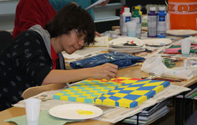 Am nächsten Tag haben wir am frühen Morgen mit Plakafarbe quadratische Keilrahmen bespritzt. Einige klebten ihre Leinwände mit Klebeband ab, sodass sie ein bestimmtes Zeichen kreierten. Durch das meist zufällige Spritzen entstanden oft schöne Muster.