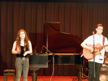 Es folgten am Flügel Philipp Klipstein und mit Gesang Milena Jockel aus der 8. Klasse, mit dem Titel „Titanium“ von Sia & David Guetta. Philipp spielt seit 5 Jahren Klavier. Beide besuchen die Musikwerkstatt in Seeheim.