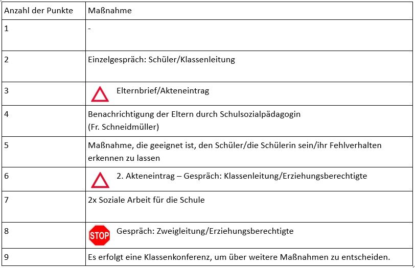 Sollte doch einmal eine Schülerin oder ein Schüler dadurch auffallen, dass sie oder er ein unangemessenes Verhalten zeigt, ist es aber auch erforderlich ein Sanktionsmittel an der Hand zu haben, um für die Zukunft die Einhaltung der Schulordnung zu begünstigen.