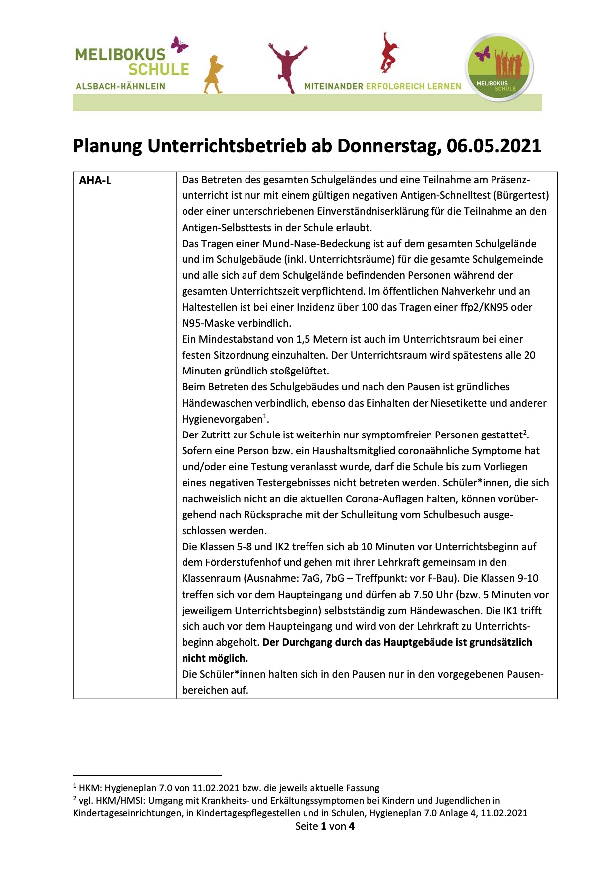 Aktuelle Mitteilung: Schul- und Unterrichtsbetrieb ab Donnerstag, 06.05.2021
