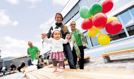 Auf den neuen Bänken lässt’s sich fein balancieren: An der Melibokusschule in Alsbach gab Schulleiterin Doris Föhr (rechts) am Samstag den ersten Teil des umgestalteten Pausenhofs offiziell frei. Die zehn Monate alte Clara hatte an den Händen von Mama Tanja Bubenzer ihren Spaß.