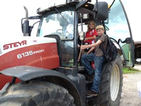 Kreiselegge mit Sähmaschine, eine Rundballenpresse, um Heu- und Strohballen zu machen, einen Mähdrescher und den Traktor. Zum Schluss haben wir frische Kuhmilch mit Bananen-, Erdbeer und Schokoladengeschmack oder ganz normale Milch getrunken. Die normale Milch war am beliebtesten.