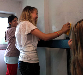 Die Damen der Klassen 8cR und 8dR säuberten in einer einmaligen Aktion die Umkleideräume der Mädchen in der Sporthalle. Mit speziellen Reinigungsmitteln, bereitgestellt von den emsigen Putzfeen der Schule, ruinierten sie für die Allgemeinheit ihre Fingernägel, denn diese Putzmittel bekommen jede Schmiererei weg!
