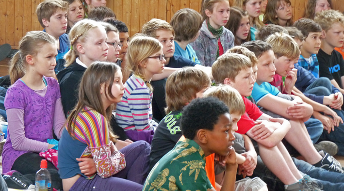 en die Schülerinnen und Schüler dennoch aufmerksam und gespannt die Darbietungen in der kleinen Turnhalle.