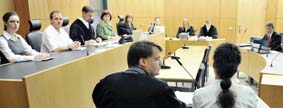 Jugendrichter D. Wacker informierte die Schülerinnen und Schüler vor Beginn der Verhandlungen über elementare Verhaltensweisen vor Gericht, an die auch wir uns zu halten hätten. Lag es an der Richterrobe oder der natürlichen Autorität des Richters: Jedenfalls war das Verhalten der Schüler im Gerichtssaal tadellos. Da Verhandlungen der Jugendgerichtsbarkeit bei Jugendlichen unter 18 Jahren in der Regel unter Ausschluss der Öffentlichkeit stattfinden, wurden im Vorfeld die Beteiligten gefragt, ob unsere Anwesenheit erlaubt sei.