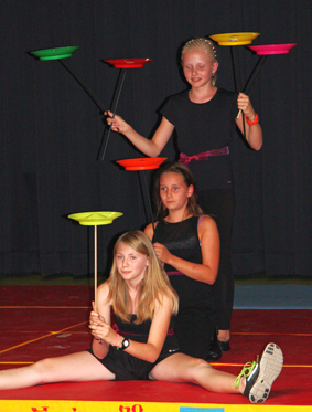 Die Vorstellung eröffnete eine Mädchengruppe mit einer Tellerakrobatik. Marlene, Helen und Laura balancierten mit bis zu vier Tellern gleichzeitig. Das Balancieren auf einer Kugel erfordert ein enormes Gleichgewichtsgefühl.