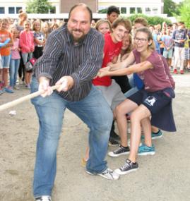 Am 8. Juli war es wieder soweit. Am Anfang der dritten Stunde ertönte eine laute Sirene aus den Lautsprechern. Die ganze Schule sollte sich auf dem Förderstufenhof versammeln. Musik, lautes Geschrei und Lachen, das war das Einzige, was man hören konnte um 9:30. Die Abschlussklassen, die etwas in der Unterzahl waren, hatten sich paar schöne Spiele für die jüngeren Schüler ausgedacht. Die Lehrer wurden ebenfalls nicht verschont, denn sie durften auch mal in den Apfel beißen.