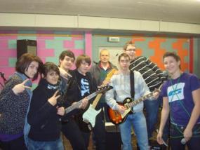 Hi, wir sind Johannes Götz (5a), Leander Schaubach (8d), Florian Stetzelberg (10c), Franziska Plößer (10c) und gemeinsam mit unserem Lehrer Nils Spruth sind wir die Schulband. Wir proben erst seit diesem Jahr zusammen, haben aber bereits jede Menge Spaß dabei. Flo und Herr Spruth spielen Gitarre, Leander und Johannes wechseln sich am Schlagzeug und den Percussions ab und Franzi ist das Multitalent am Bass (oder am Klavier).